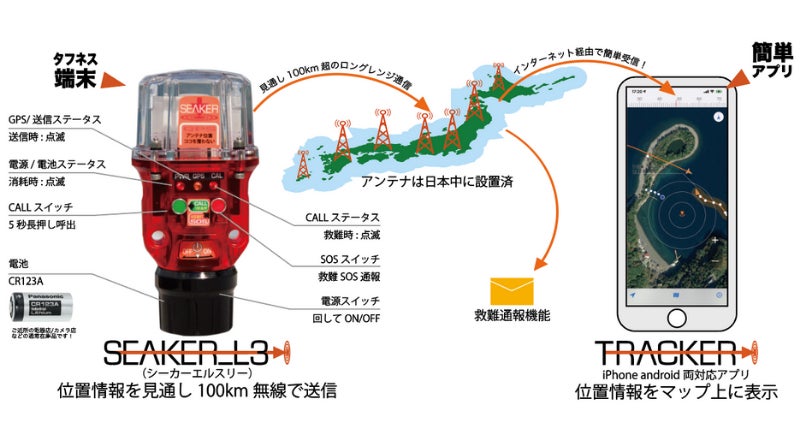 万一の緊急時には、SOSスイッチを9回連打してください。SEAKER_L3は救難モードへ移行し、近くに居るTRACKERアプリ保持者に救難を要請、さらに事前登録しておいたご家族などへサーバーがメールを送信。救難を知らせます。