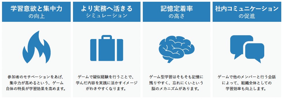 これまでの研究結果により、ゲーム型学習は「学習意欲と集中力の向上」「より実務へ活きるシミュレーション」「記憶定着率の高さ」「コミュニケーションの促進」から、他の学習方法より学習効率が高いと証明されています。