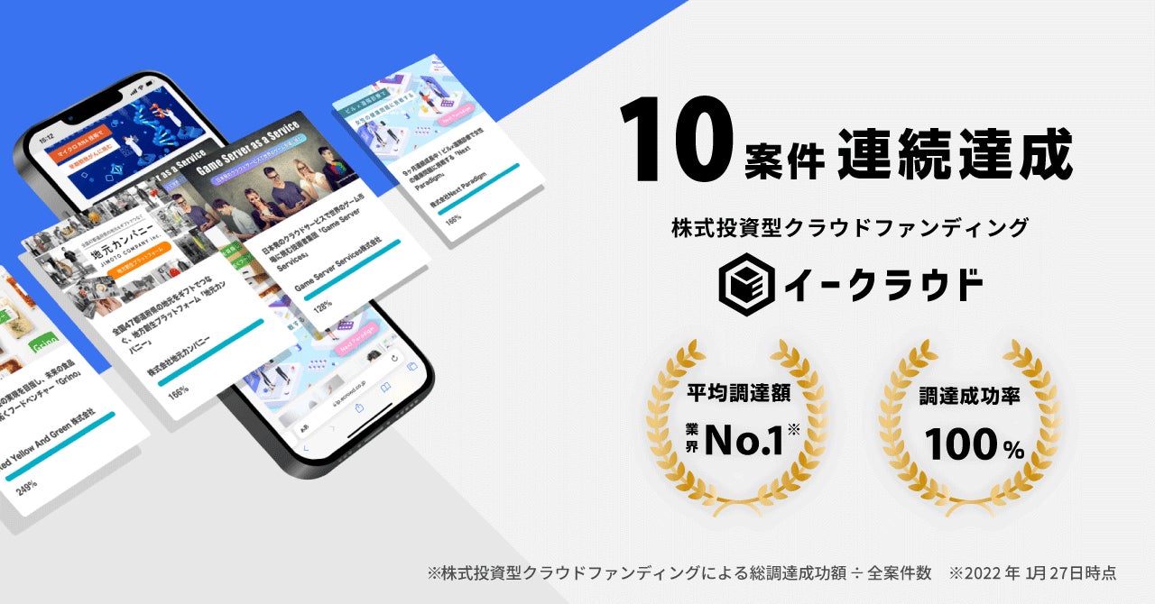 イークラウド株式会社(東京都中央区、代表取締役:波多江直彦、以下「イークラウド」)」は株式投資型クラウドファンディングを運営しています。2022年1月にイークラウドで募集を開始した案件が目標募集額を上回り、サービス開始以降10案件すべての目標募集額を連続達成することができました。