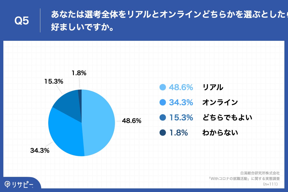- 選考全体をリアルとオンラインどちらかを選ぶとしたら48.6%が「リアルが好ましい」と回答、34.3%が「オンラインが好ましい」と回答