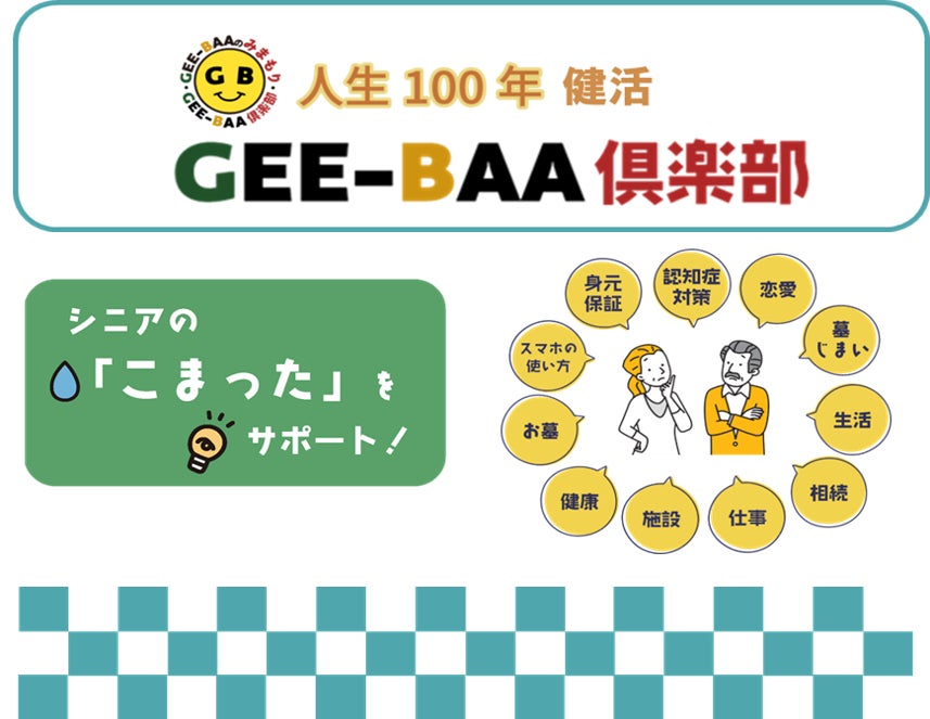 さらに「GEE-BAAのあんしん」サービスで身元保証、生前葬・お墓あんしん、相続・生前整理など終活の悩みもまるっと解消いたします。外出が困難なシニアの方にはハートフルネス事業で培った寺院連携「法要三昧」というオンラインで月例法要に参加できるサービスやハートフルネスアプリ「ポケットメモリーズ」でメタバースのお墓、仏壇にお参りができ、シニアのメンタルケアや日々の安らぎにつながるサービスをご利用いただけます。