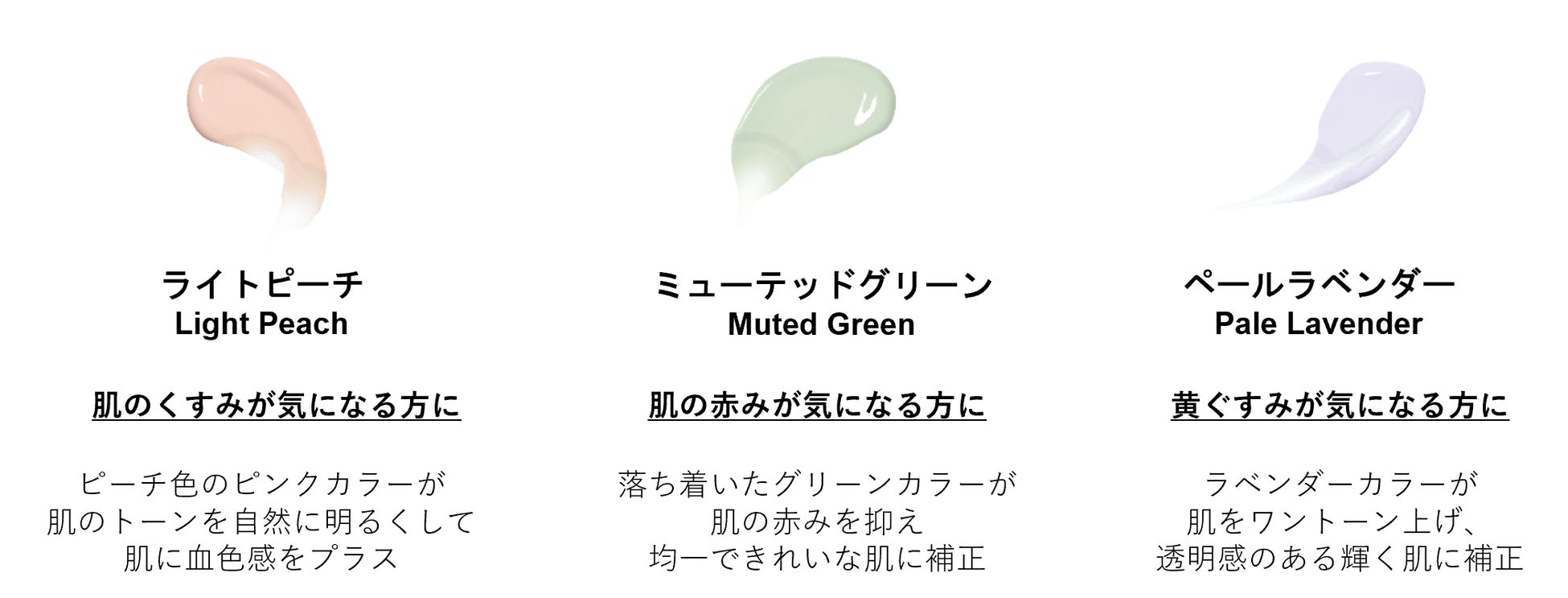カラーはライトピーチ、ミューテッドグリーン、ペールラベンダーの3色展開。肌のお悩みに合わせて選ぶことができます。「セカンドスキン」シリーズのアイテムを使ったベースメイクで、夏も透明感溢れるツヤ肌メイクをお楽しみください。