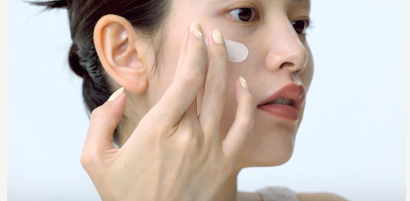 適量を指に取り顔片方ずつやさしく馴染ませます。