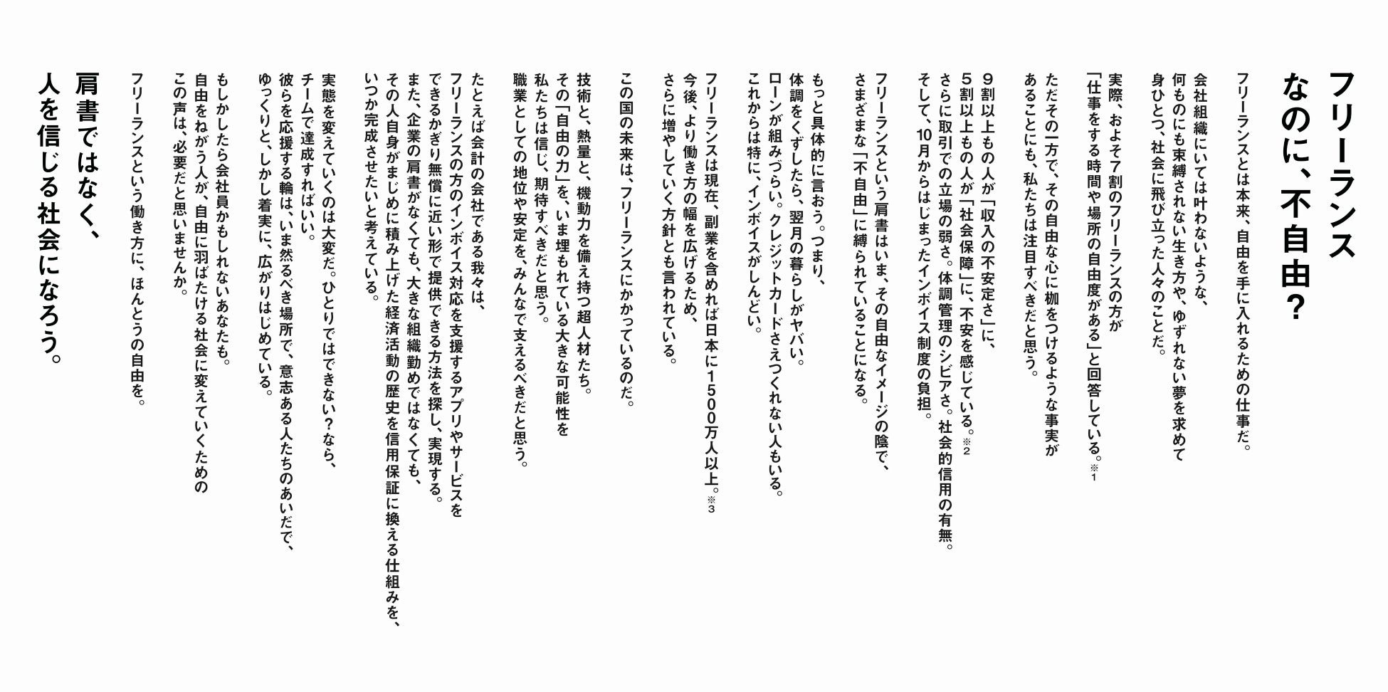 広告を通じて、少しでもフリーランスという働き方への支援の輪が広がるきっかけになればと考えています。