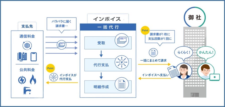 (株)インボイスでは、お客様に代わり請求書を受領し、通信キャリヤやサプライヤーへの支払いを代行することで、お客様への請求をおまとめし1本化する【一括請求サービス】を提供しています。