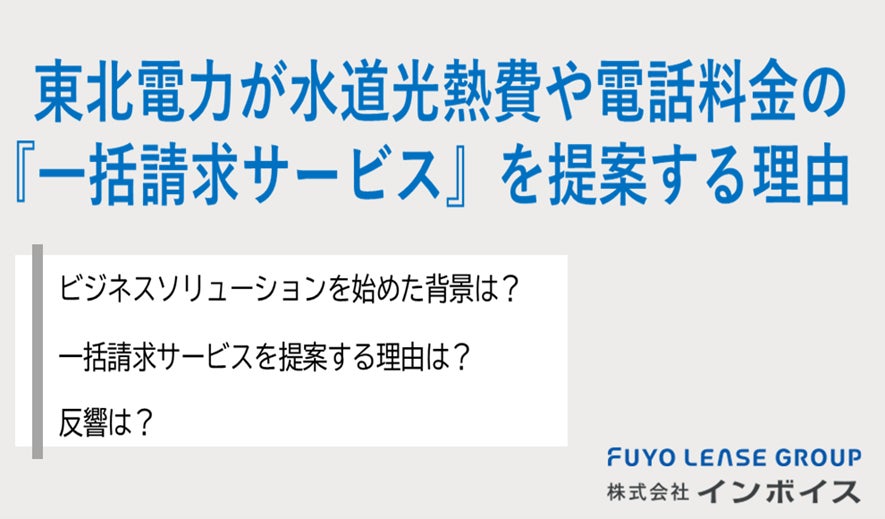 受取請求書の一括請求サービスを提供する、株式会社インボイス(代表取締役:加茂 正巳 本社:東京都千代田区)は、東北電力株式会社がお客様の業務効率化支援を目的に展開する「ビジネスソリューションサービス」のラインアップで一括請求サービスを提案する理由について、インタビュー内容を公開したのでお知らせします。