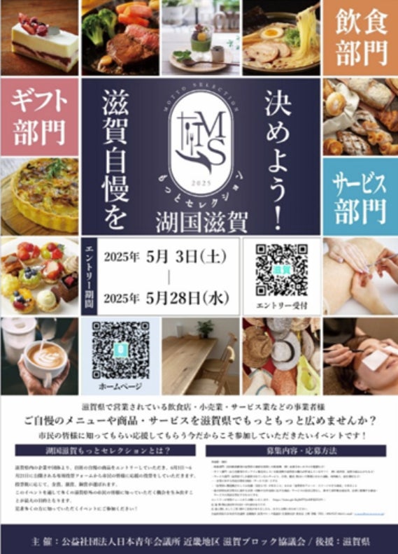 公益社団法人日本青年会議所近畿地区滋賀ブロック協議会(会長:佐野智哉)は、『滋賀が誇る美味しい食べ物』『心がほっとするギフト』『人の想いがこもったサービス』をもっと多くの方に知ってもらうため、『湖国滋賀もっとセレクション』を開催いたします。