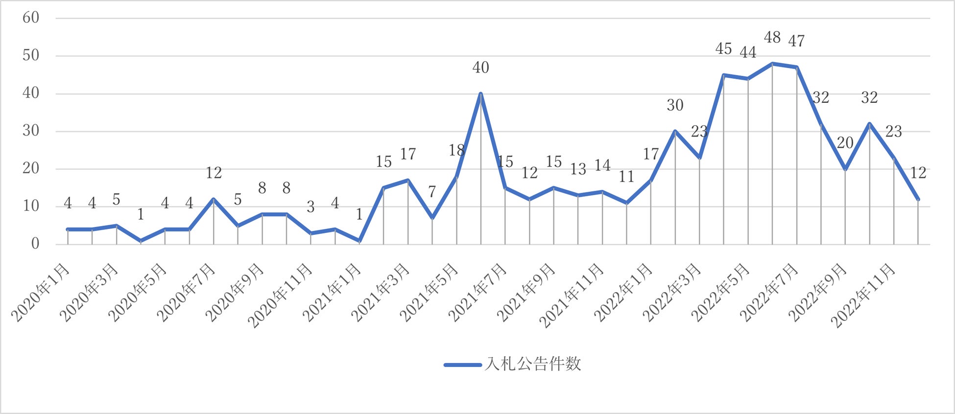 2020年以降の入札公告件数を月別で見てみると、こちらも「カーボンニュートラル」の件数推移同様に、2021年6月に一度40件と大幅に増加しました。その後は12月まで安定した入札公告件数となり、2022年に入ると、公告件数に増加の傾向が見られました。2022年の2月には30件に増加すると、4月は2021年6月よりも多い45件となり、7月まで毎月40件以上公告され、8月以降も平年よりも多いことが分かりました。