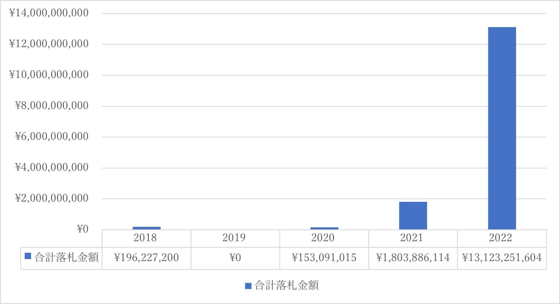 続いては、2018年から2022年までの過去5年間の落札件数の推移です。過去5年間の合計落札件数は230件でした。推移としては、入札公告同様2021年から大幅な増加となりました。