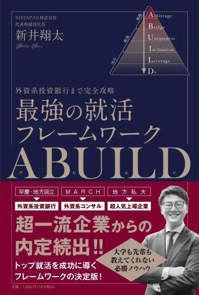 豊かな次世代のために、自ら輝く人財を輩出するキャリア構築サービス、「Abuild就活」創設の新井翔太の著書、『外資系投資銀行まで完全攻略 最強の就活フレームワーク ABUILD』が、ジュンク堂書店池袋本店の社会科学書(ビジネス・時事・法律・経済)週間ランキングにて2位を獲得(※1)したことをお知らせします。