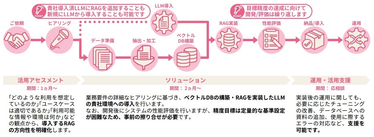 LLMをビジネス活用するために必要なアセスメントから運用まで一気通貫でご支援します。