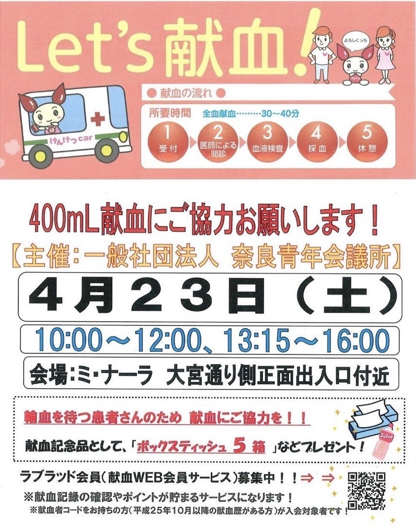 一般社団法人奈良青年会議所は4月23日にミ・ナーラにて献血活動を行います