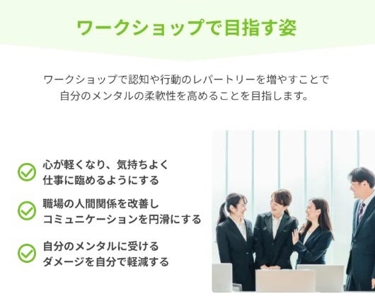 ワークショップを通して、自分自身の認知や行動を振り返り、より役立つ認知を身につけ、場面や状況に応じた問題解決に役立つ考え方や行動を身につけることができます。
