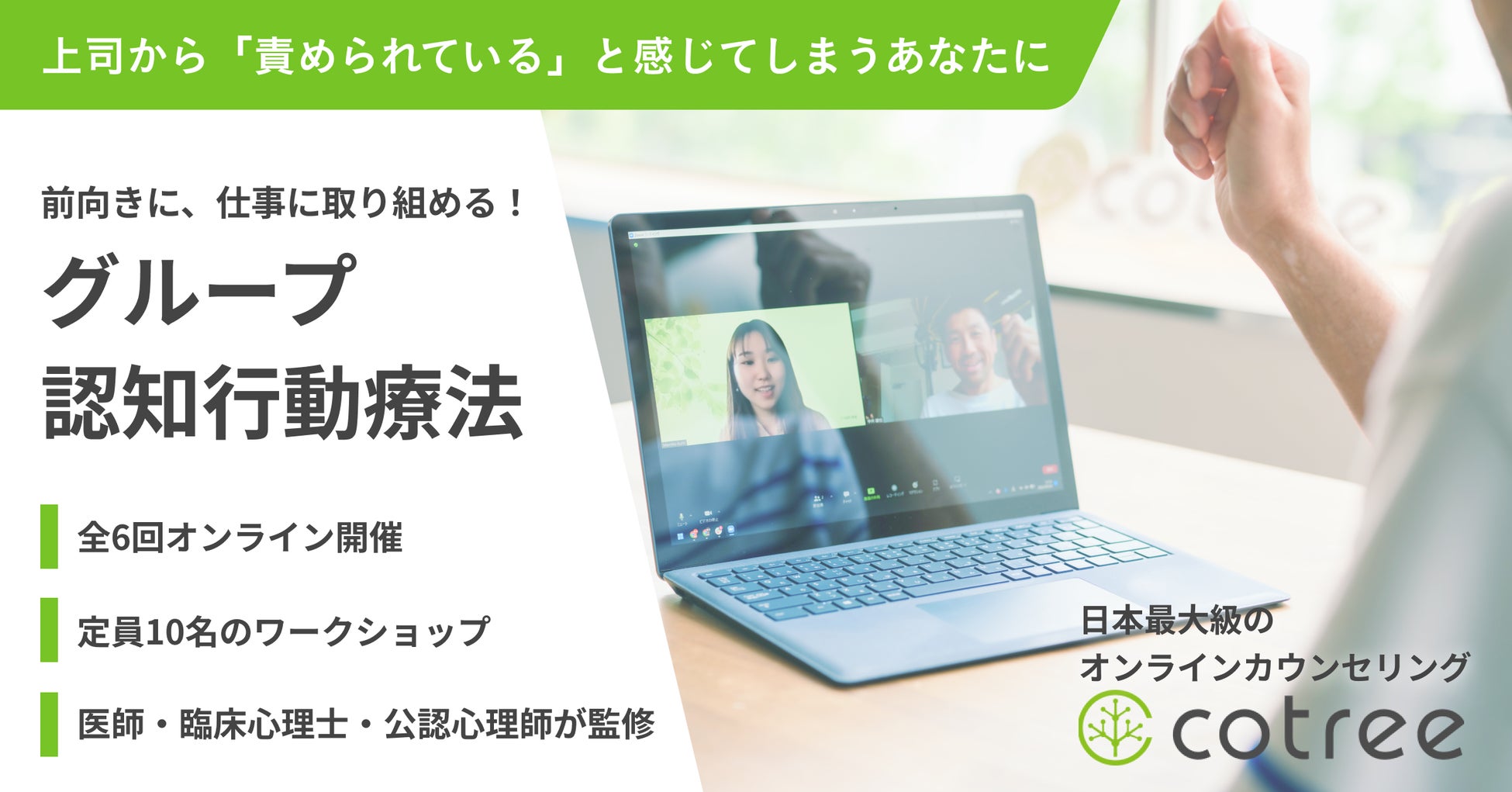 オンラインカウンセリング・コーチングの「cotree」を展開する株式会社cotree(本社:東京都港区、代表取締役:西岡 恵子、以下cotree)は、2022年11月18日(金)から「グループ認知行動療法ワークショップ」を開催することをお知らせいたします。第1回目は、臨床心理士・公認心理師の上河邉 力先生をお迎えして、精神科医の前田 佳宏先生監修のもと、上司から「責められている」と感じてしまう人向けの「オンライングループ認知行動療法ワークショップ」です。ぜひ皆さまのエントリーを心よりお待ちしています。