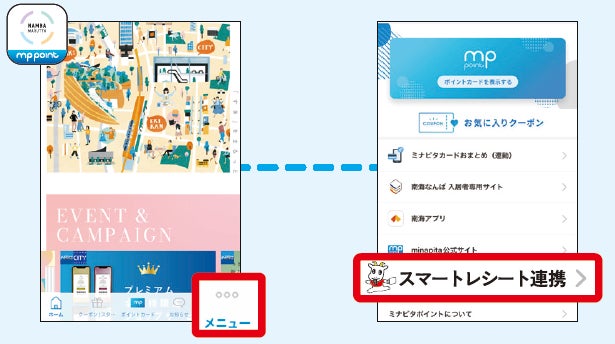 タイトル:「NAMBAMARUTTO(なんばまるっと)」アプリと「スマートレシート®」連携で100ポイントプレゼントキャンペーン概要:期間中、新規に「スマートレシート®」と「NAMBAMARUTTO(なんばまるっと)」アプリを会員連携した方に、もれなく「ミナピタポイント」100ポイントをプレゼント