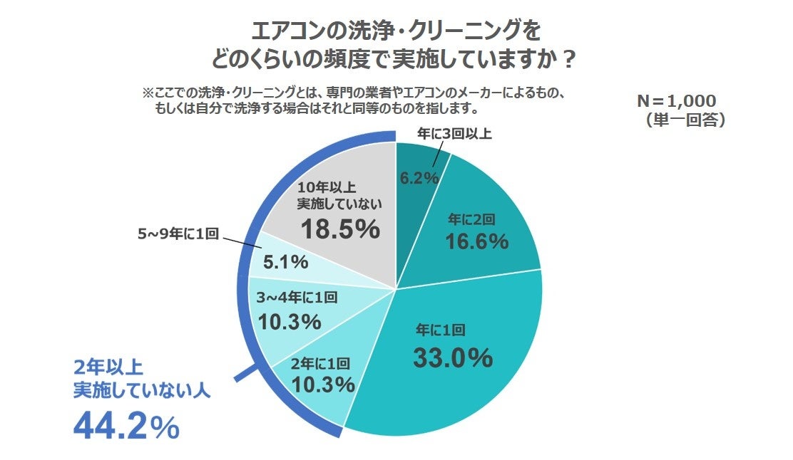 さらに、エアコンの洗浄・クリーニングの実施頻度を聞いたところ、約7割の人が年に1回以上必要だと考える一方で、実際には約4割の人は2年から10年以上実施していないことが判明しました。このギャップの理由として約3割の人が費用の負担を感じていました。