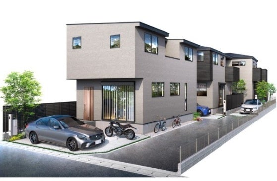 前面道路に面するアプローチ部分は、カースペース配置を工夫することで開放感を創出。協定道路は通り抜けが