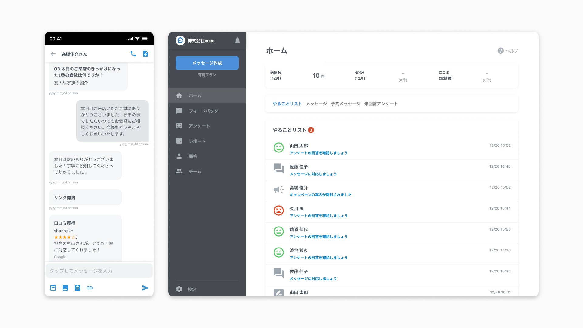 「現場接客DXサービス coco」では、デジタルアンケート機能を始め、Googleマップ口コミ獲得や、お客様とのチャットコミュニケーション、その他様々な集客強化や、業務効率化機能がご利用いただけます。
