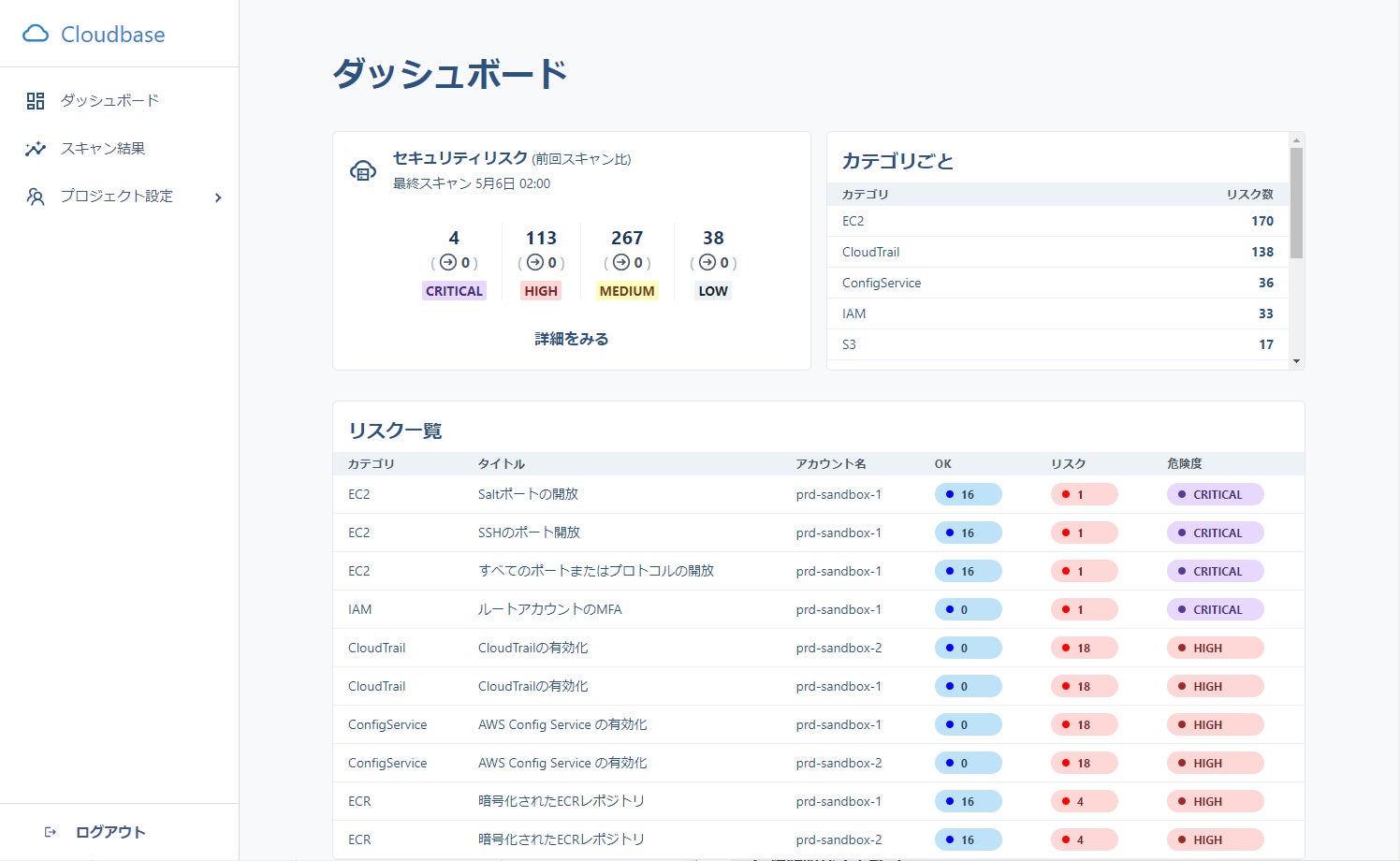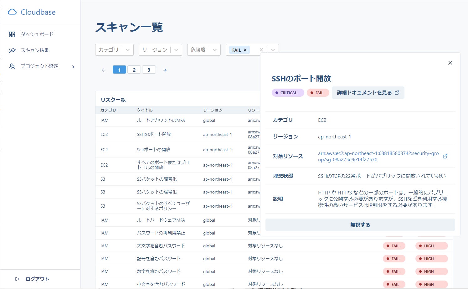 「Cloudbase」では、危険度順に設定ミスを確認することができるため、リスクの高いものから対処することが可能です。