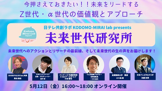 「みんながワクワクする未来」に向けた共創の仕組みである「日テレ共創ラボ」のKODOMO-MIRAI labとして取り組む本イベントでは、未来世代やその社会を「洞察・開発」しているラボ(研究所・研究者)の皆様や、「コンテンツ」や「学び」など未来世代に対して様々な体験を生み出すキーパーソンを招いたトークセッションを行う予定です。本イベントを通じて、未来世代の「好き」の発見や、「好き」なものとの関係値、そして「好き」の生み出し方について考えます。