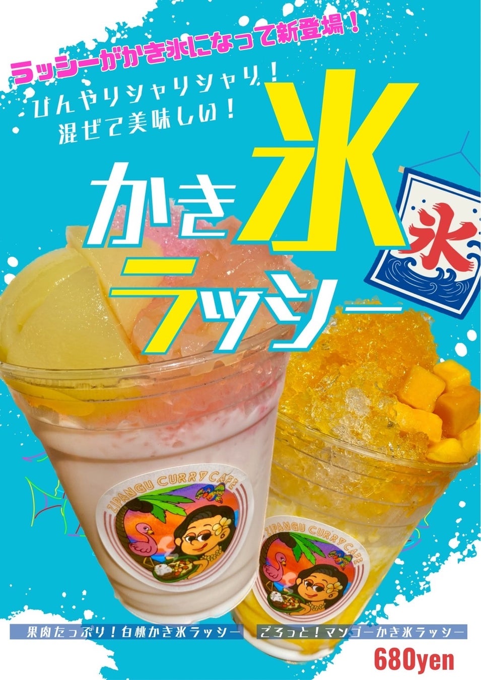 2023年7月25日 〜 9月24日の期間中、ラッシーとかき氷が融合した「かき氷ラッシー」をジパングカリーカフェ中崎町本店の店舗で680円(税込)で販売を開始します。かき氷は2種類用意されており、今が旬のフルーツである、マンゴーの『ごろっと!マンゴーかき氷ラッシー』モモの『果肉たっぷり!白桃かき氷ラッシー』が用意されており、店内飲食、テイクアウト共に対応しています。