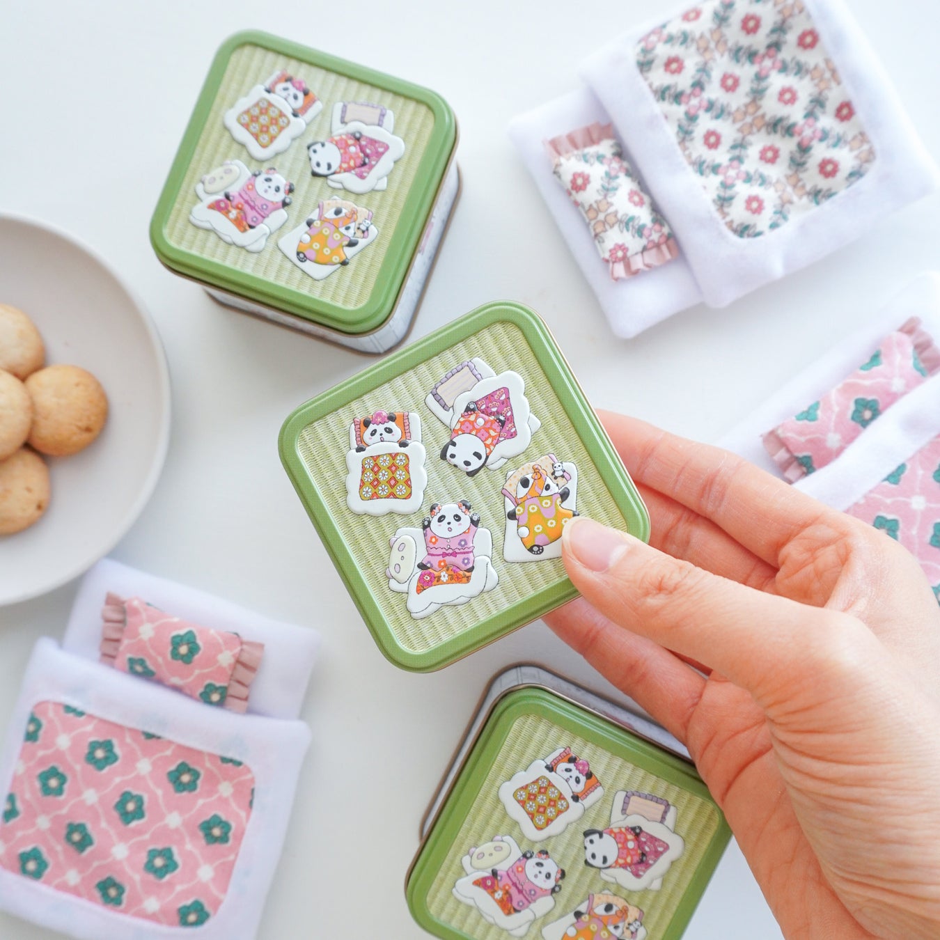 蓋面には"畳"の上で仲良く寝ているミニチュアパンダたち、側面にはパンダの応接室、カレーを食べるパンダたち、お風呂を楽しむパンダの親子、お化粧中のパンダのお部屋など『パンダのお家』を描きました。