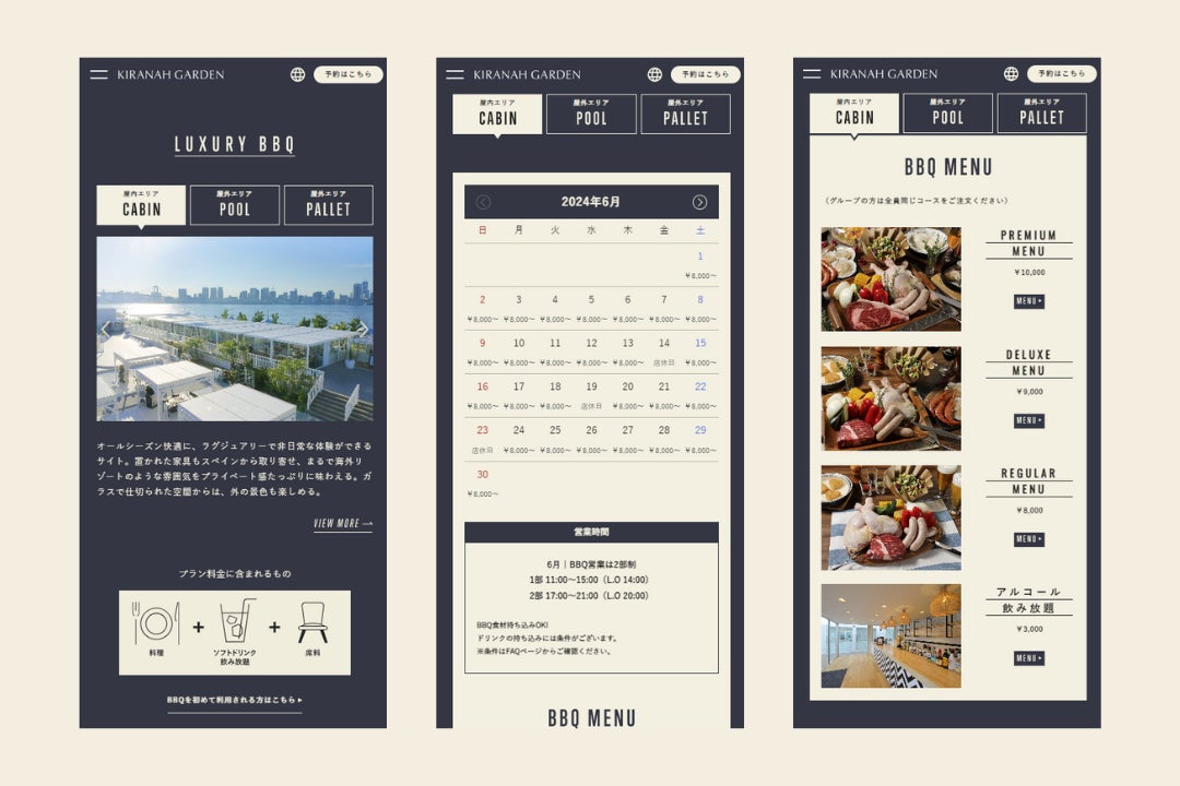 当施設は、約7,000㎡の敷地に3つのエリア、700席を有する都内最大級のBBQ施設です。多様なエリアやメニューの中から、お客様ごとに異なる利用用途やご予算にあわせて、最適な利用プランを選択できるよう、エリアごとに特徴やメニューをビジュアルで表示。さらに、日程ごとの料金を一覧化表示することで、比較しやすいサイトに進化しました。