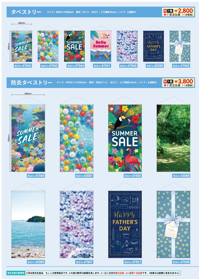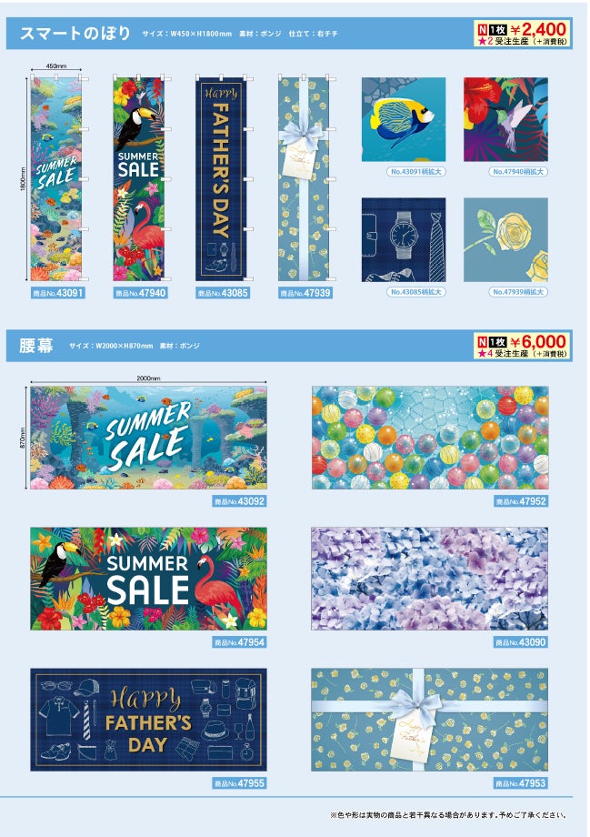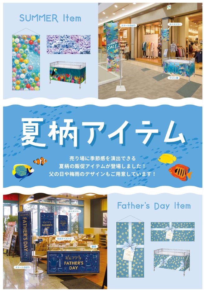 夏柄の販促アイテムは、ワゴン幕やスマートのぼり、腰幕、タペストリーなど様々なアイテムを取り揃えており、売り場を鮮やかに彩ります。夏の売り場を盛り上げたい方におすすめのアイテムとなっています。ご注文はお早めに!