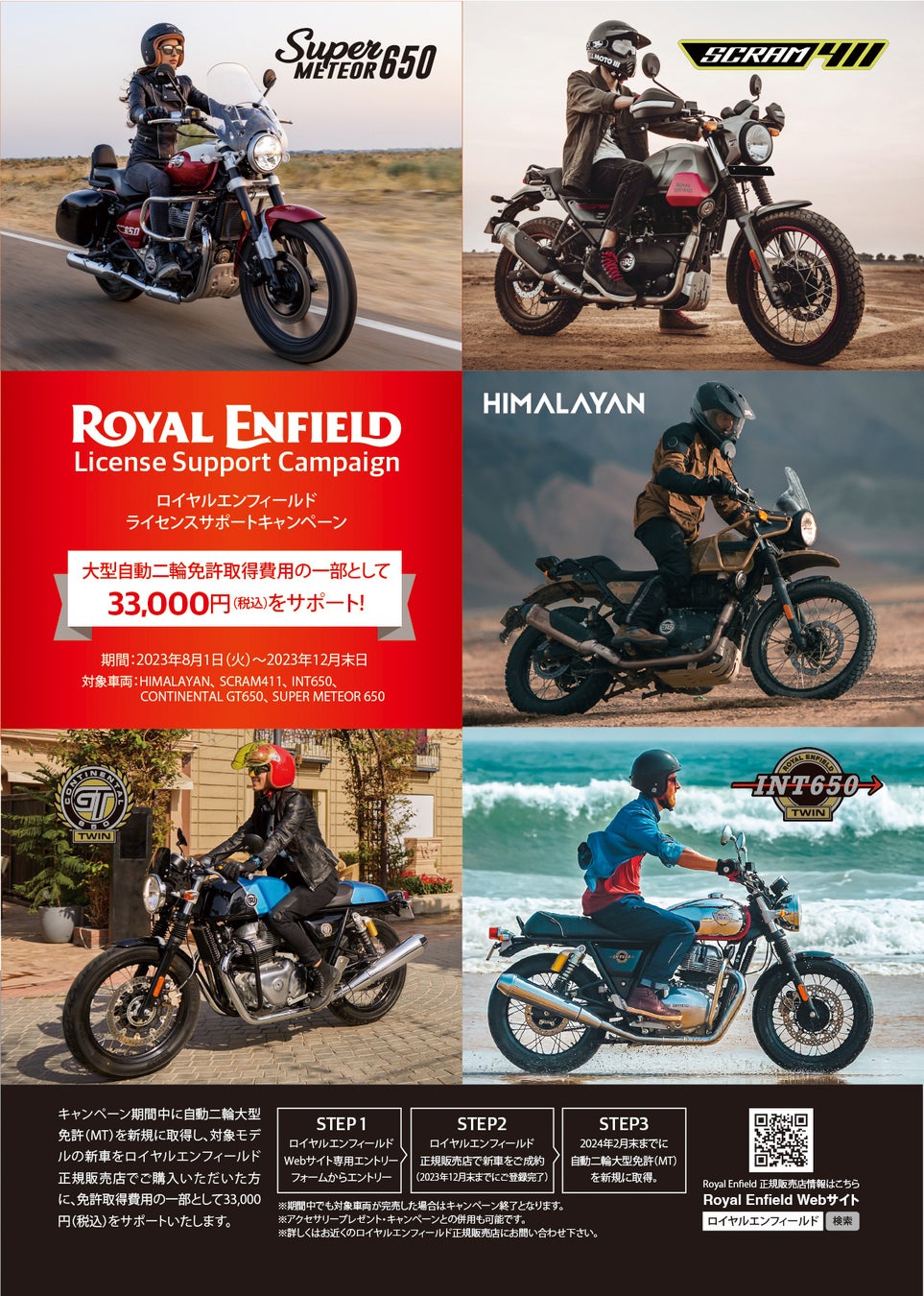 キャンペーン期間中に自動二輪大型免許(MT)を新規に取得し、対象モデルの新車をロイヤルエンフィールド正規販売店で購入した方に免許取得費用の一部として33,000円(税込み)をサポートいたします。
