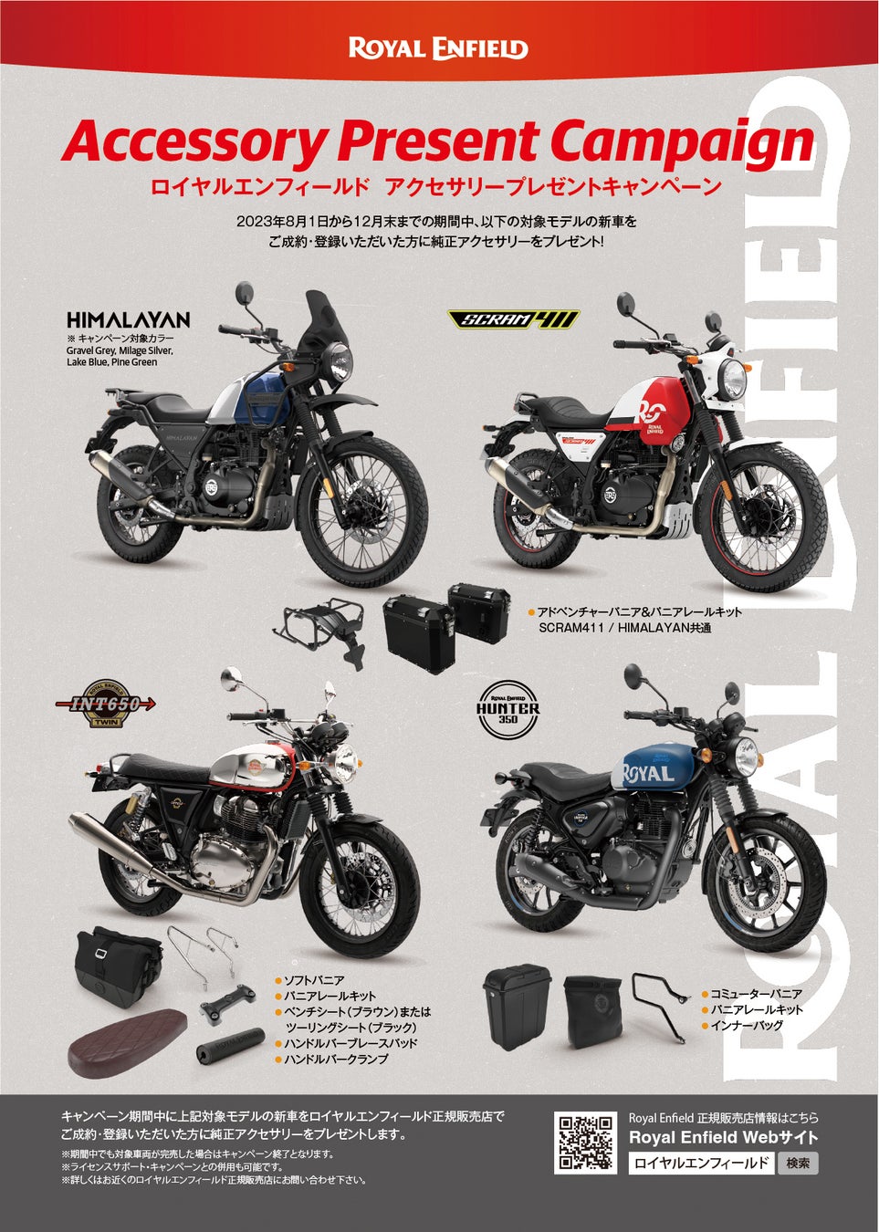 キャンペーン期間中に対象モデルの新車をロイヤルエンフィールド正規販売店で成約、登録いただいた方に純正アクセサリーをプレゼントいたします。