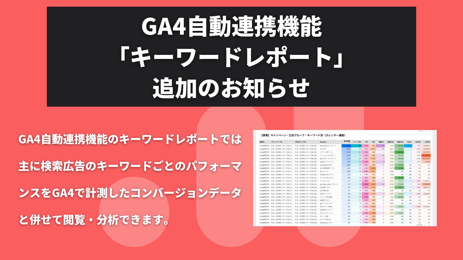 そして今回は、このGA4自動連携機能に「キーワードレポート」を追加いたしました。