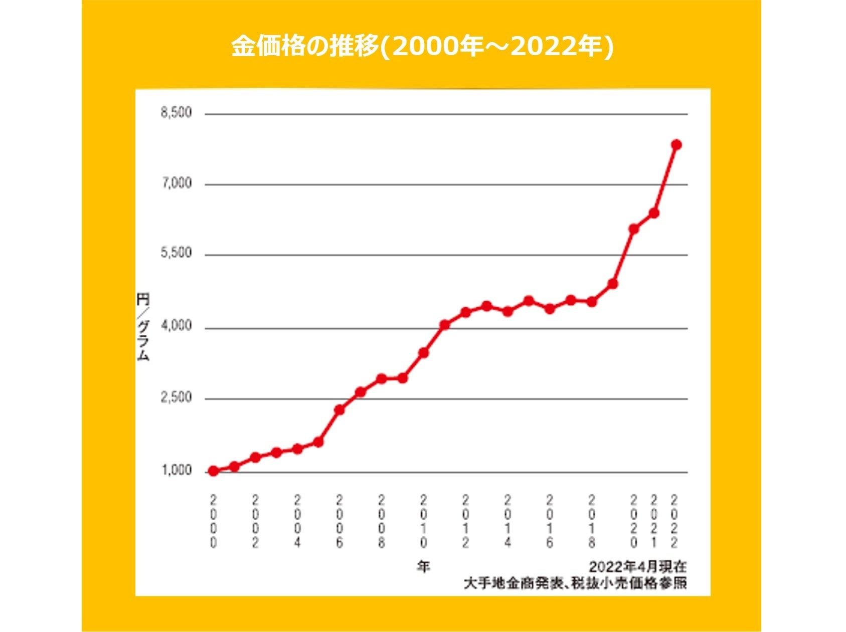 2年前から上昇を続けていた金相場は、コロナ危機を起点に各国の金融緩和や政府の財政出動などの影響を受け、高値安定で推移していました。その中、世界情勢が大きく揺らぎはじめたことを受け、現物資産への期待がより一層高まったことにより、4月20日には過去最高値8,969円(大手地金商発表税込小売価格)を記録しました。この不安定な状況は今後も続くと見られており、「金」への注目は継続するといわれています。