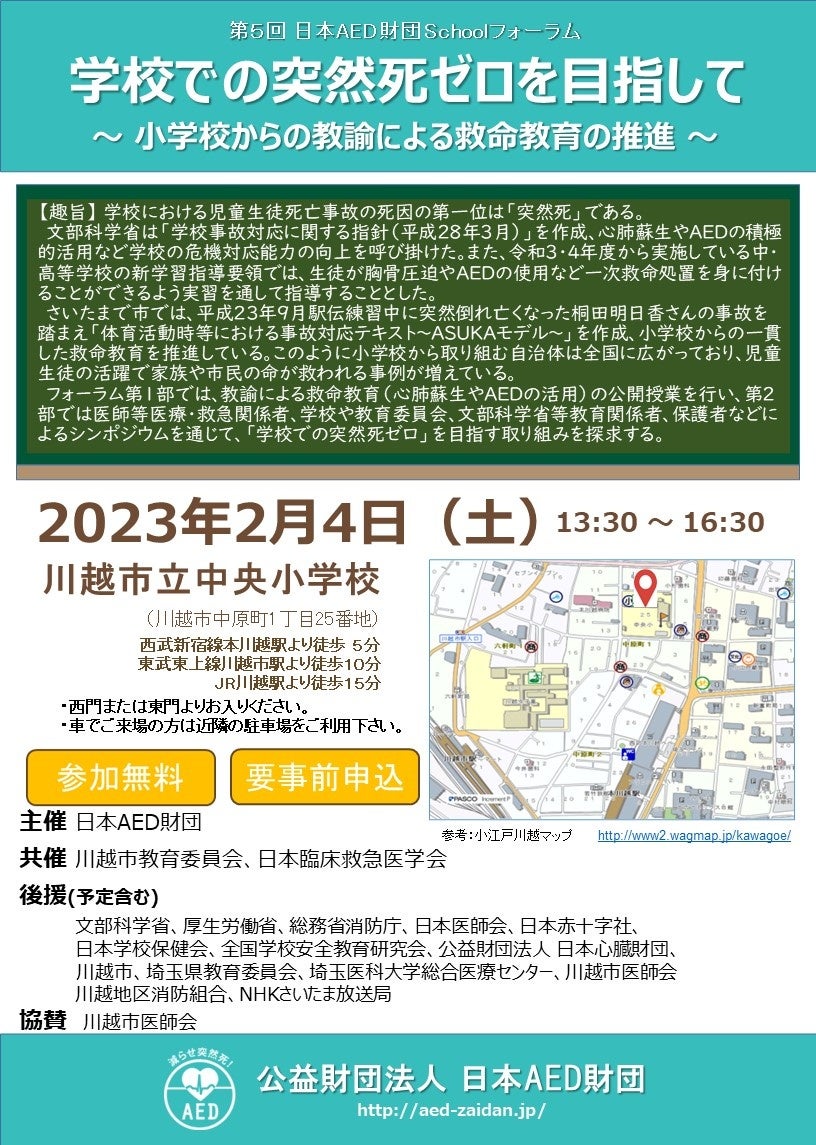 ※ 新型コロナウイルスの感染状況により、開催直前でも中止の判断をさせていただく場合があります。中止の際は、日本AED財団のホームページでお知らせ致します。
