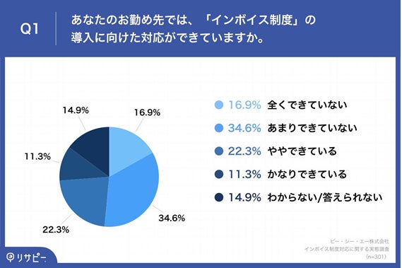 「Q1.あなたのお勤め先では、「インボイス制度」の導入に向けた対応ができていますか。」(n=301)と質問したところ、「全くできていない」が16.9%、「あまりできていない」が34.6%という回答となりました。