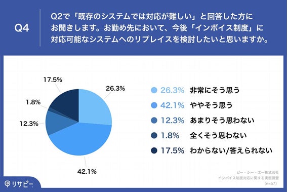 Q2で「既存のシステムでは対応が難しい」と回答した方に、 「Q4.お勤め先において、今後「インボイス制度」に対応可能なシステムへのリプレイスを検討したいと思いますか。」(n=57)と質問したところ、「非常にそう思う」が26.3%、「ややそう思う」が42.1%という回答となりました。