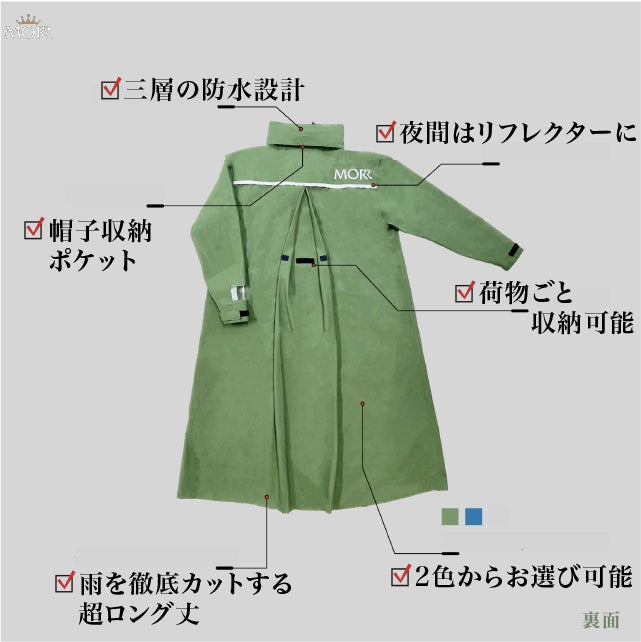MORRは、防水加工が施された生地と3層の防水設計を採用し、極端な暴風雨ももろともしない、超高品質レインコートです。自転車バイクでの通勤通学や普段のお出かけ、キャンプ・アウトドアなど様々な場面でご利用いただけます。