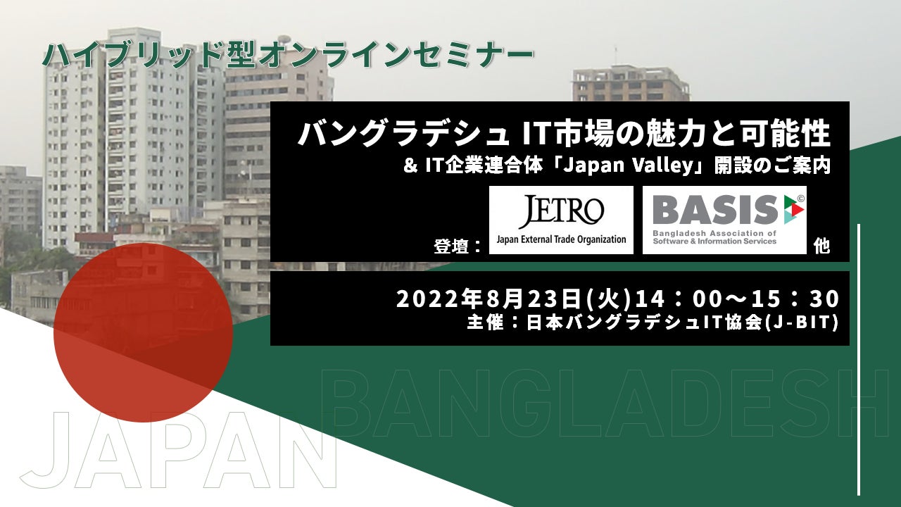 SUN株式会社は、JETROダッカとBASISをお迎えし「バングラデシュIT市場の魅力と可能性」についてセミナーを開催いたします。また、「一般社団法人日本バングラデシュIT協会」から、2022年9月にバングラデシュにて設立予定のIT企業の連合体『Japan Valley』についてご案内をいたします。