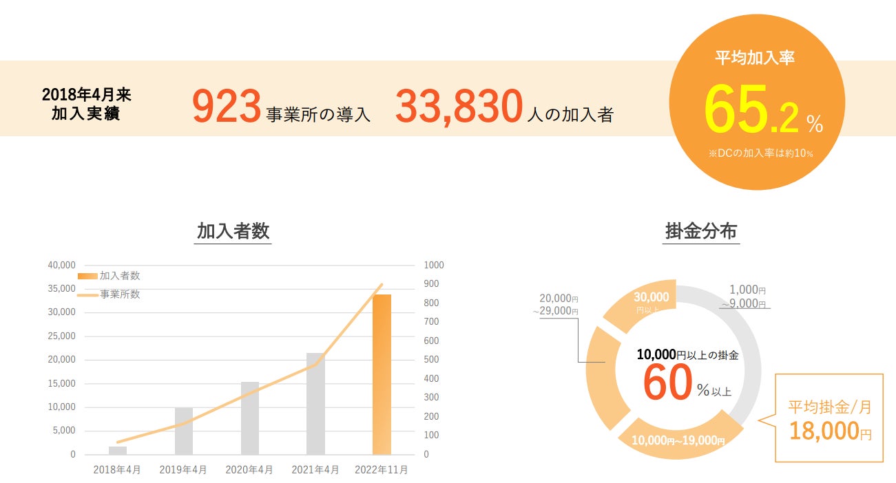 従業員側のメリットには、難しい投資の知識が不要で、元本が保証されていることがあげられます。また、原則60歳以上にならないと受け取りができない企業型DC(企業型確定拠出年金)やiDeCo(個人型確定拠出年金)に比べて、退職時や休職時、育児・介護休業時にも受け取ることが可能なため、育児や介護を将来に控える従業員から厚い支持を集めています。現在、加入事業所のうち73%が医療・福祉関係となっておりますが、他業界の法人様にもご加入いただけます。