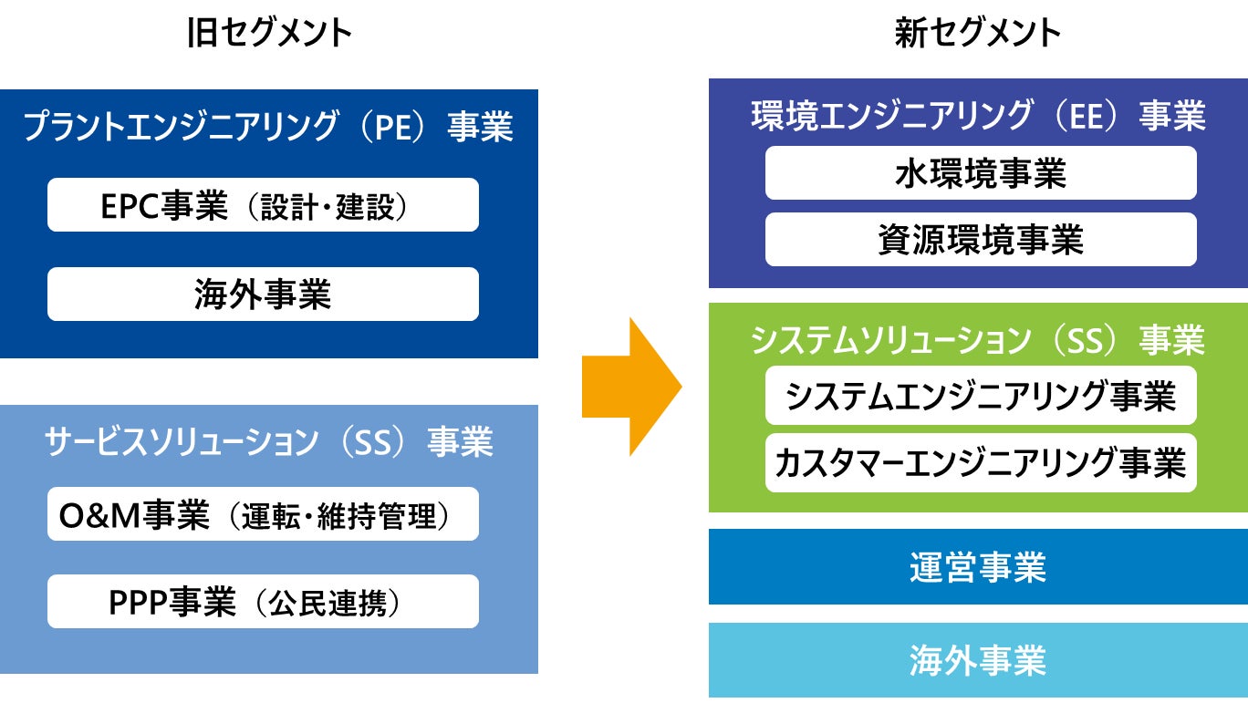 従来の2区分(プラントエンジニアリング事業、サービスソリューション事業)から、4区分(環境エンジニアリング事業、システムソリューション事業、運営事業、海外事業)に変更します。