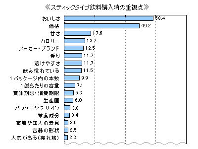■スティックタイプ飲料購入時の重視点は「おいしさ」「価格」の他、「甘さ」「カロリー」「メーカー・ブランド」「香り」「溶けやすさ」「飲み慣れている」などが続く