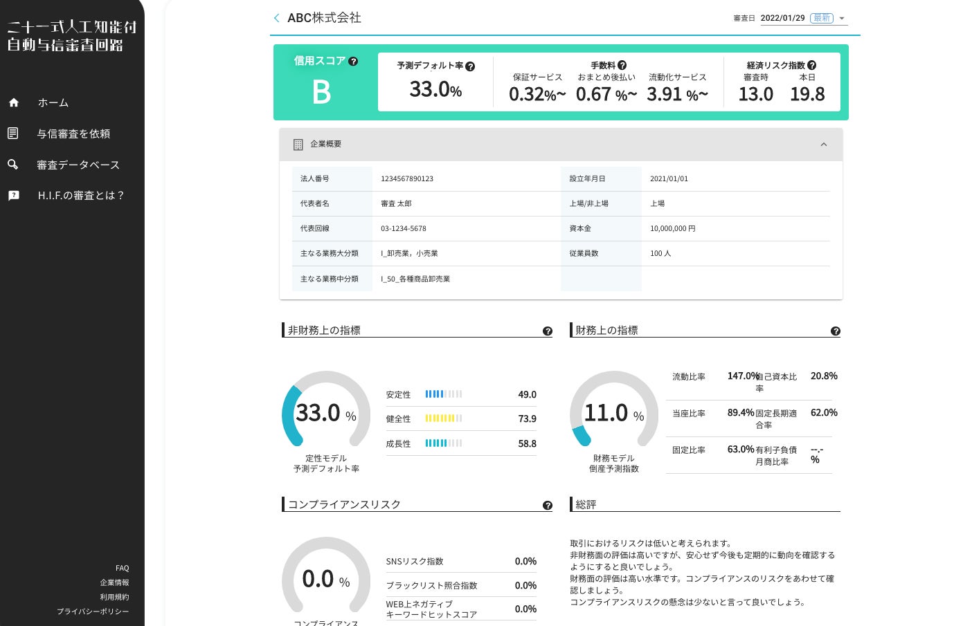 従前の与信審査で評価される「財務状況」に加え、「定性的特徴」「コンプラリスク」「経済動向」、取引リスク発生実績を学習済みのAIモデルを搭載した、与信審査WEBサービスです。