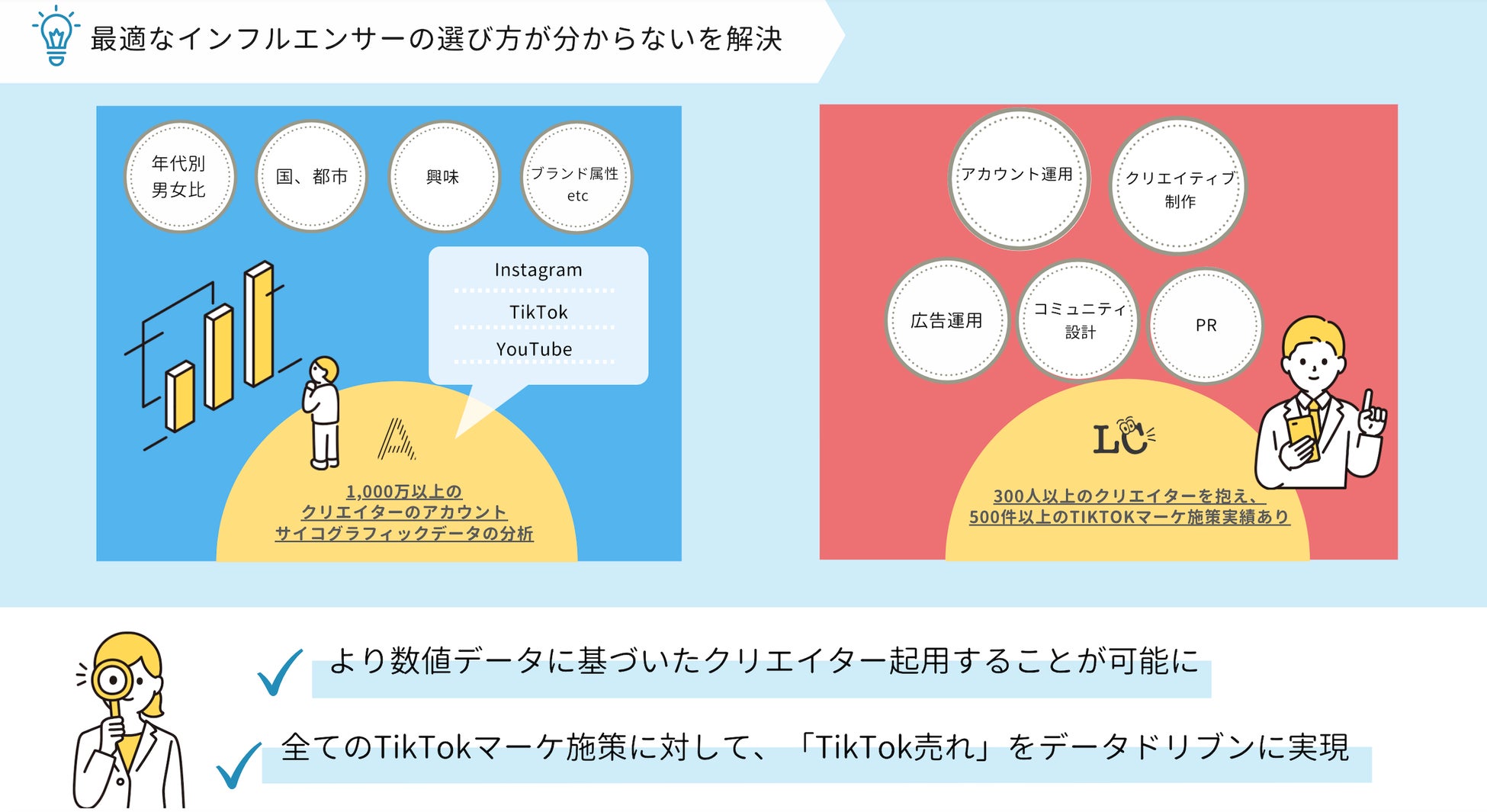 LCは、株式会社Aと提携することにより、LCのTikTokマーケティングのナレッジと株式会社Aのマーケティングツール「Astream」によるアカウント、クリエイターのサイコグラフィック情報をかけあわせて、効果の最大化を図ることでマーケティング精度を高めることが可能になります。