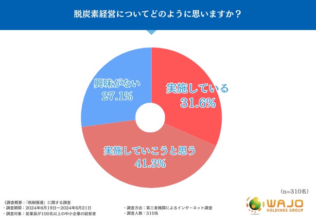 『脱炭素経営についてどのように思いますか?』と質問したところ、「実施している(31.6%)」「実施していこうと思う(41.3%)」と全体の7割以上が脱炭素経営の実施に前向きでした。