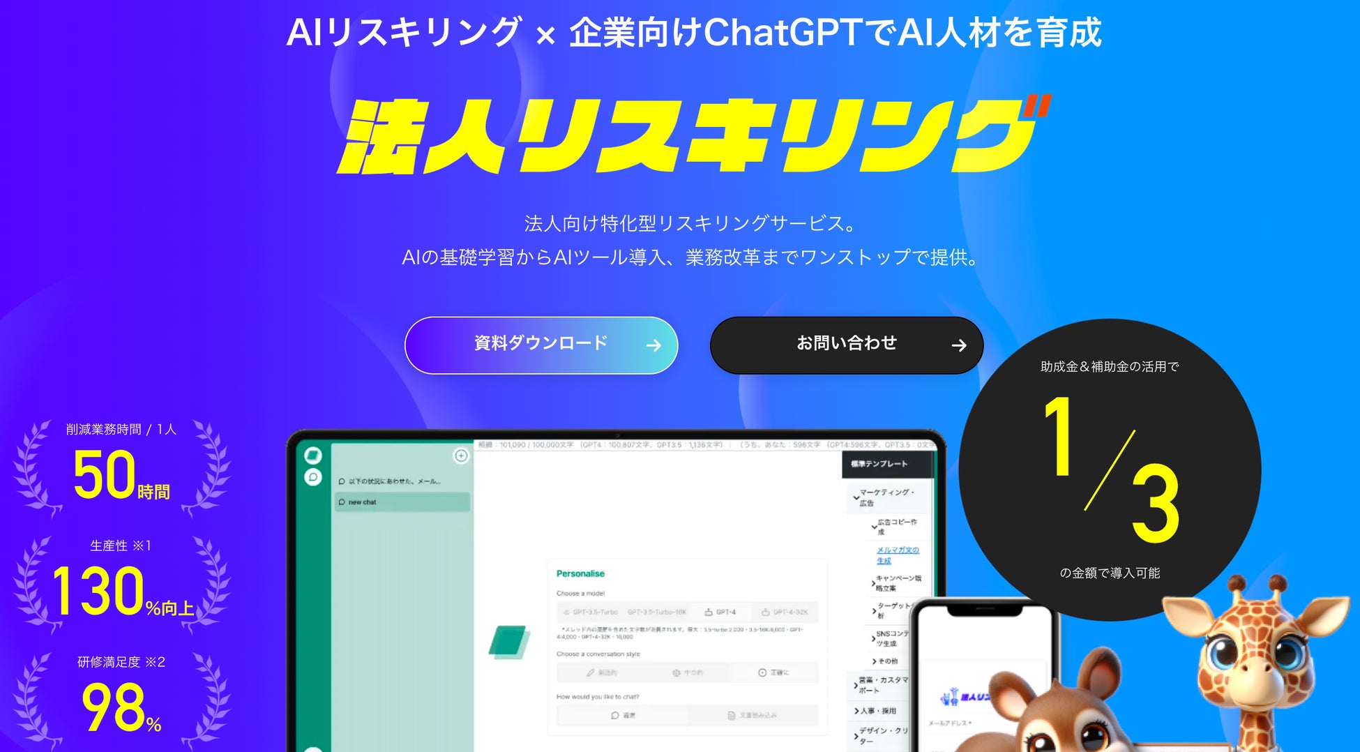 株式会社デジライズは「AIの利便性と感動を全ての人に届ける」をビジョンとして2023年に事業を開始しました。「法人リスキリング®︎」というAI研修(動画学習+ワークショップ)と自社開発の企業向けChatGPT「AI Works」を提供するサービスを、上場企業を筆頭に多くの企業様に導入を進めております。IT導入補助金や助成金を通じて安価に同サービスをご利用いただけるのも弊社の強みです。また、AIシステムの受託開発も行なっており、研修、ツール提供、開発を通じて、日本企業でのAI人材育成・AI活用を促進し、日本全体の生産性向上の実現を目指しております。
