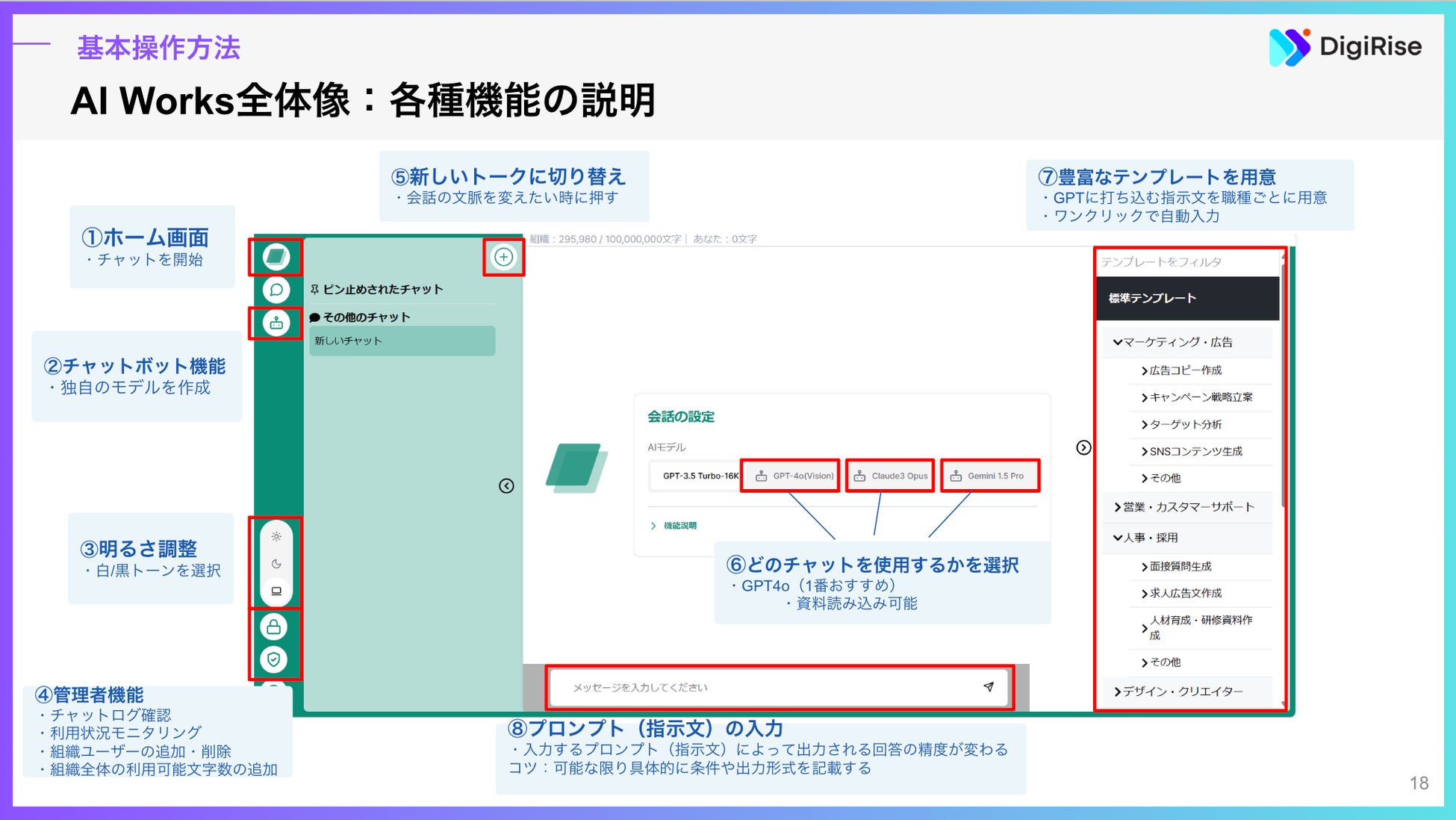 - AIチャットボット作成機能 - プロンプトテンプレート機能 - ファイル解析機能(PDF、Word、Excel、PPT、CSV対応) |