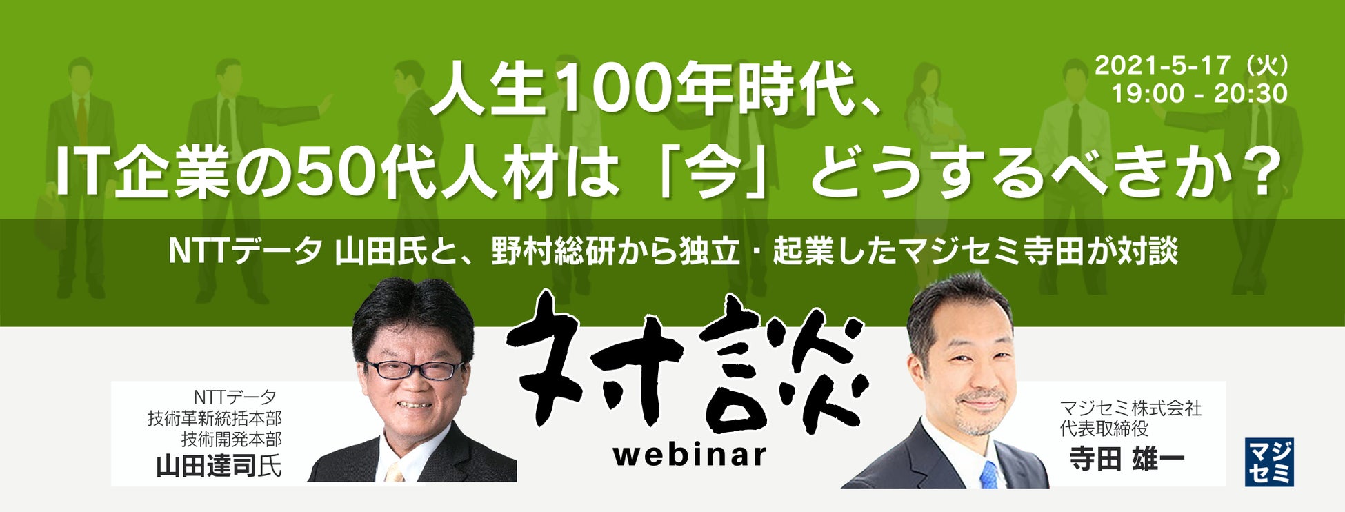 本セミナーでは、NTTデータ 山田氏と、IT企業の役職定年者 角谷氏、野村総研から独立・起業したマジセミ寺田が対談、「IT企業の50代人材」の不安や、「IT企業の50代人材」の活躍を阻害する要因について議論していきます。