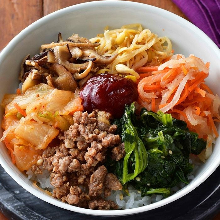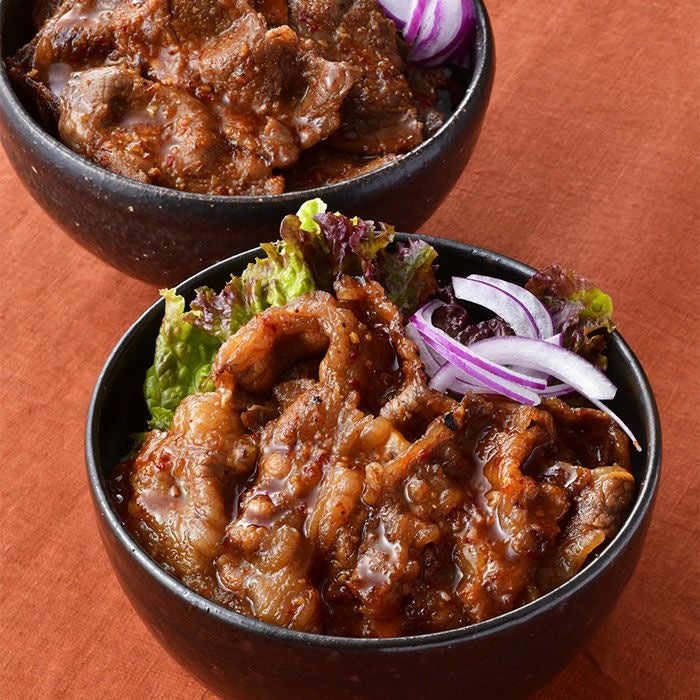 自然豊かな牧場で、餌にこだわり独自のプログラムで飼育した4X ビーフをプルコギ風に甘辛く味付け。さっぱりとした4種のナムル、白菜キムチとセットに。彩りに加え、甘・辛・酸のハーモニーが食欲をそそる。(2023年7月15日発売開始)