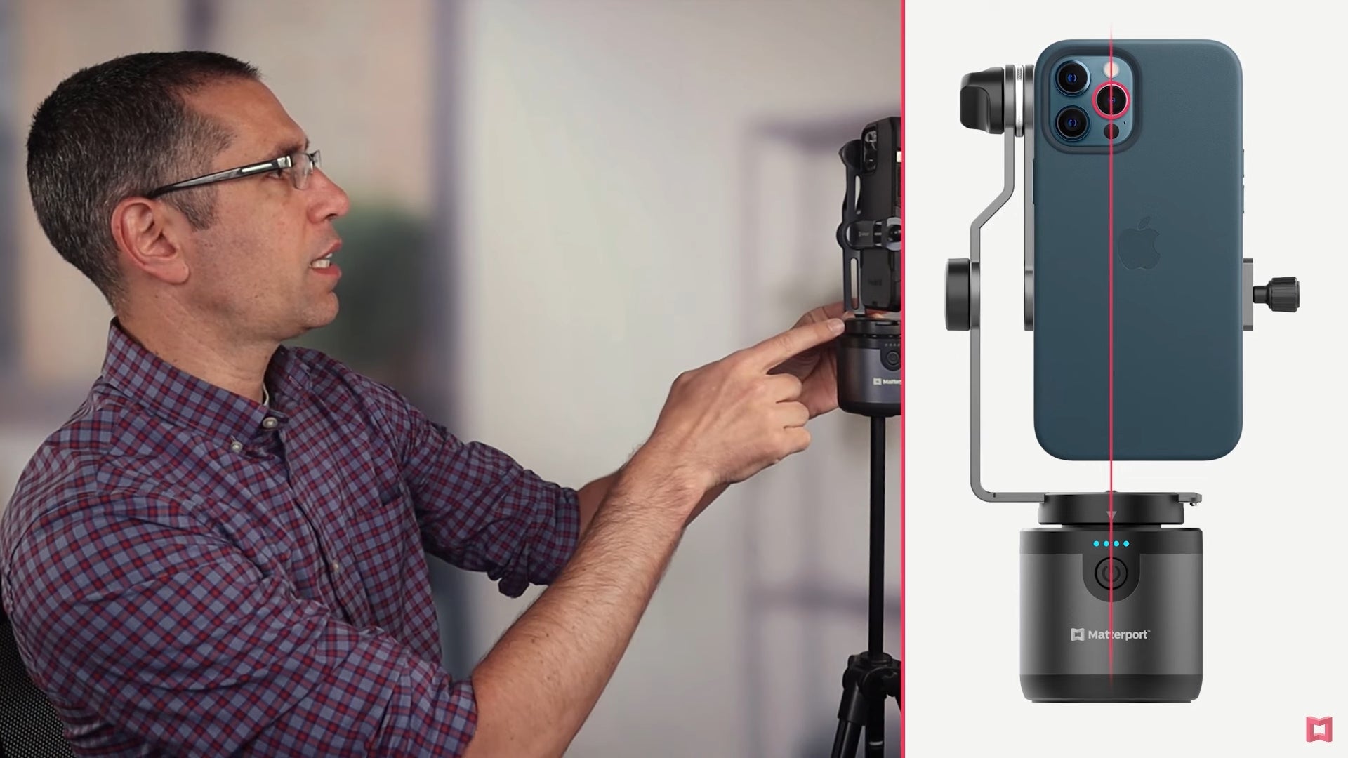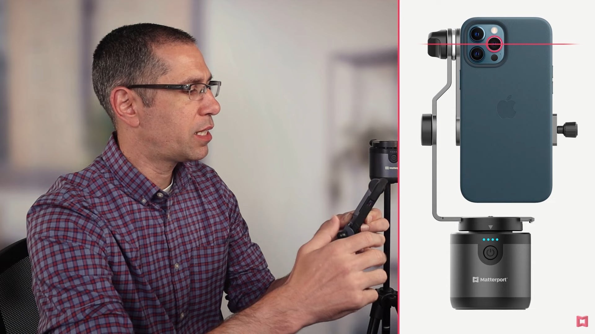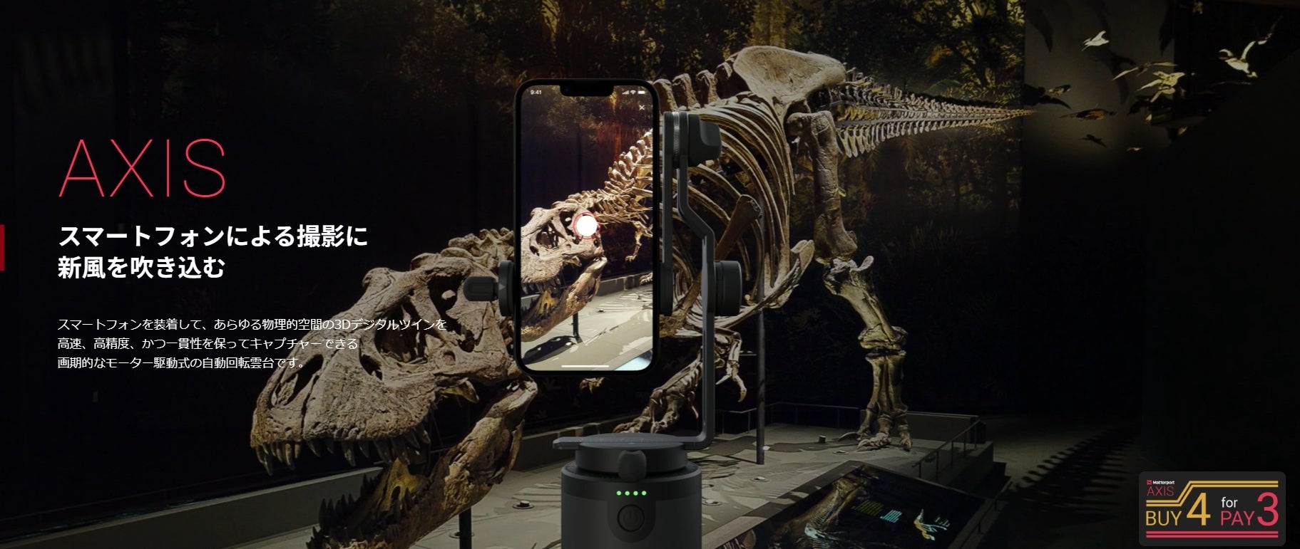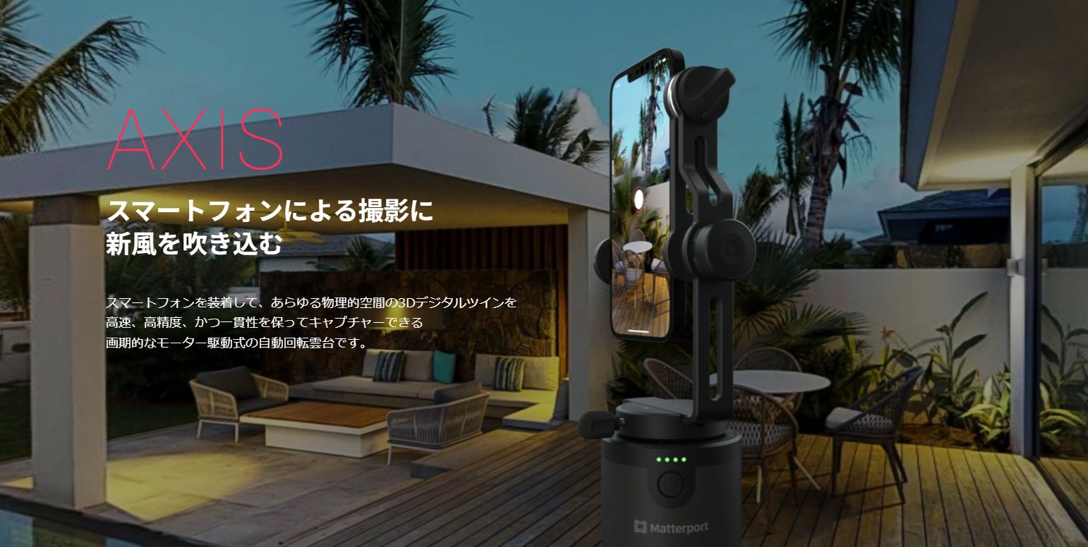 リビングCGが提供する「Matterport Axis」は、先進的な3Dスキャン技術を搭載した自動回転雲台で、iPhoneなどのスマートフォンを装着して使用します。