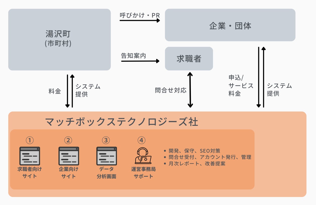 本事業ではマッチボックステクノロジーズがプラットフォームの提供および管理保守・運用を行い、企業はマッチボックステクノロジーズに利用申し込みを行います。利用企業による湯沢町内を就業地とした求人は「ゆざわマッチボックス」およびアプリケーション上に集約され、湯沢町内の求人を全国から閲覧・応募することができるようになります(https://matchbox.jp/niigata/yuzawa/)。