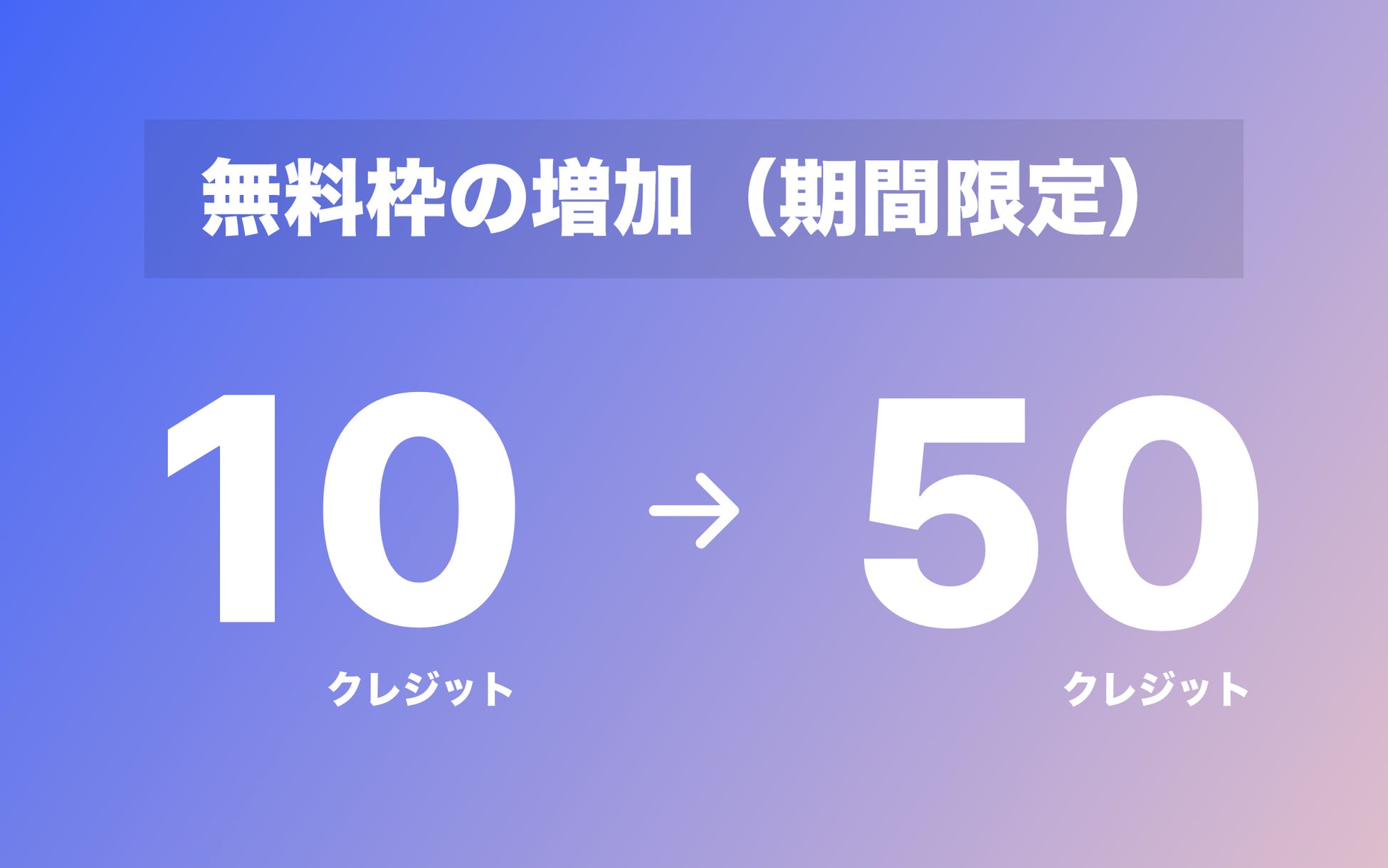 この性能をいち早く皆様に体験していただくために、2022年11月30日 AM 08:00 以降に新規登録をされる方の無料クレジット(※)を 10 から 50 に増やすことを決定しました。12月14日(水)までの期間限定キャンペーンとなります。